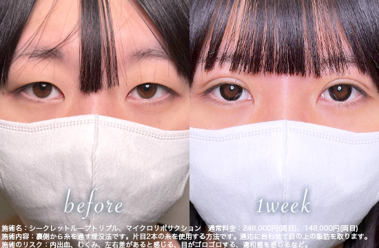 ずっと二重整形したいと思っていたけど、、「瞼の厚み・たるみで二重整形を諦めていた」というお客様。 【眉下リフトメニ重形✕目頭切開】の複合施術で、長年のお悩みだった瞼の厚み・たるみ、重い一重瞼がスッキリしました。 お目元も可愛らしく、若々しくなりました。 施術を受けて、本に綺麗な二重になれて「想像以上の仕上がり」に大満足です!と、大変喜んでくださりました。 -------------------------------- 施術名:眉下リフト(眉下切開) 通常料金:252,000円〜618,000円 施術内容:眉下リフトは眉毛の下のラインを切開し、余剰皮膚や場合によって余分な脂肪も除去して引き上げることで瞼のたるみや目の開きを改善する施術です。 施術のリスク:内出血、痛み、むくみ、凹凸・左右差があると感じる、違和感を感じるなど。 施術名:シークレットループトリプル 通常料金:348,000円(両目) 施術内容:裏側から糸を通す埋没法です。片目3本の糸を使用する方法です。 施術のリスク:むくみ、左右差があると感じる、目がゴロゴロする、違和感を感じるなど。 施術名:目頭切開 通常料金:298,000円(両目) 施術内容:目頭を数ミリ切開して蒙古襞を取る施術です。 施術のリスク:むくみ、左右差があると感じる、目がゴロゴロする、違和感を感じる、傷跡など。 施術名:ボトックス(アラガン) 通常料金:18,000円〜 施術内容:筋肉の過剰な動きをやわらげることにより、しわを軽減します。 施術のリスク:腫れ・内出血・アレルギー・表情の違和感など。